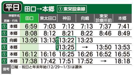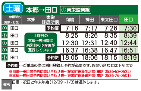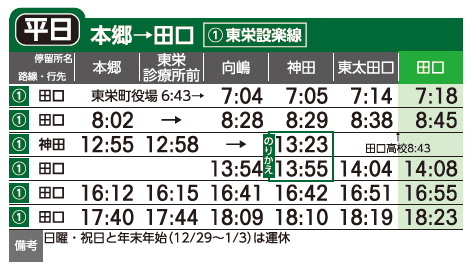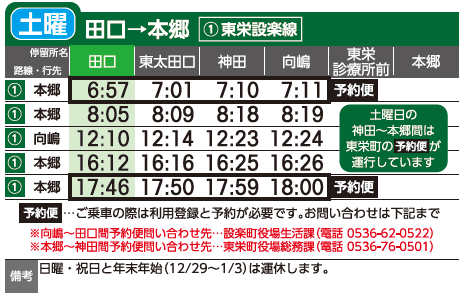 平日と土曜日に運行します。東栄町側は土曜日は予約便のみです。日曜日・祝日・年末年始(12月29日~1月3日)は運休します。